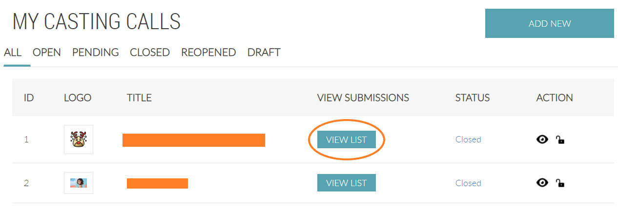 2. Under MY JOBS, you will see the casting calls that you’ve placed. Click the VIEW LIST button and you’ll be able to view a list of that who have submitted for the job.